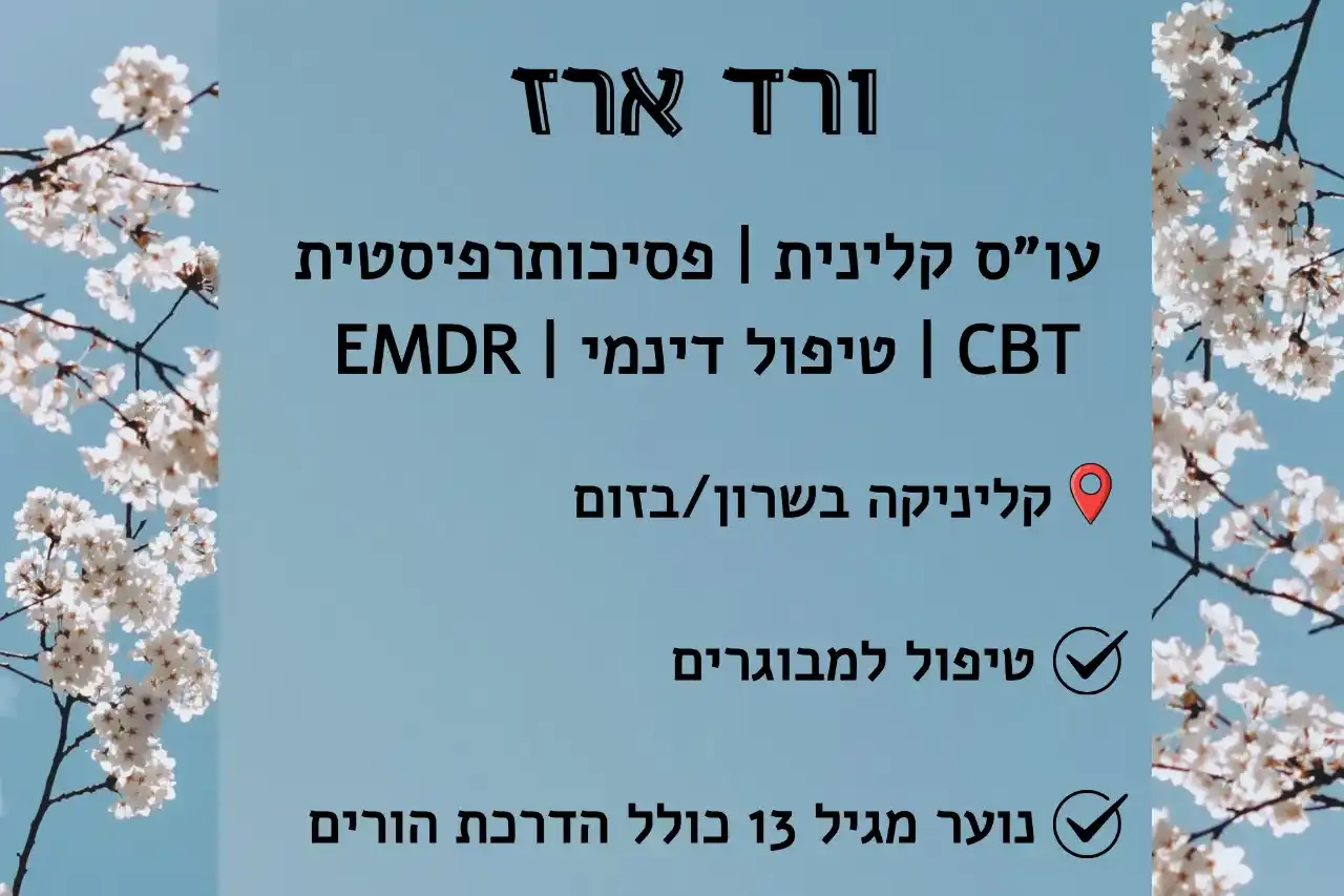 שמי ורד, עו"ס קלינית (תואר שני) ופסיכותרפיסטית פרטנית למבוגרים ונוער. מטפלת בעין שריד (אזור השרון, ליד קדימה-צורן) ובזום. בעלת B.A בפסיכולוגיה וקרימינולוגיה, בוגרת הכשרות מתקדמות בטיפול בטראומה (EMDR שלב 1), טיפול קוגניטיבי-התנהגותי (CBT), פסיכותרפיה ממוקדת טראומה, זכרונות ילדות, ליווי אובדן ושכול, סכמה תרפיה, מיינדפולנס ועוד. הניסיון שלי נבנה לאורך שנים של ליווי מצבי משבר מורכבים: בצה"ל שירתתי כקצינת נפגעים במשך 16 שנה, במהלכן ליוויתי משפחות שכולות, פצועים קשים וחולים אונקולוגיים. עבדתי גם כמתאמת שיקום למתמודדי נפש, וסיימתי סטאז' בטיפול נפשי למבוגרים ונוער. מטפלת במצבים כגון: חרדה, טראומה, דיכאון, אובדן, דימוי עצמי נמוך, משברי חיים ועוד. הטיפול מותאם אישית, תוך שילוב גישות ממוקדות ופרקטיות לצד הקשבה עמוקה. מטפלת בנוער (מגיל 14) ובמבוגרים.